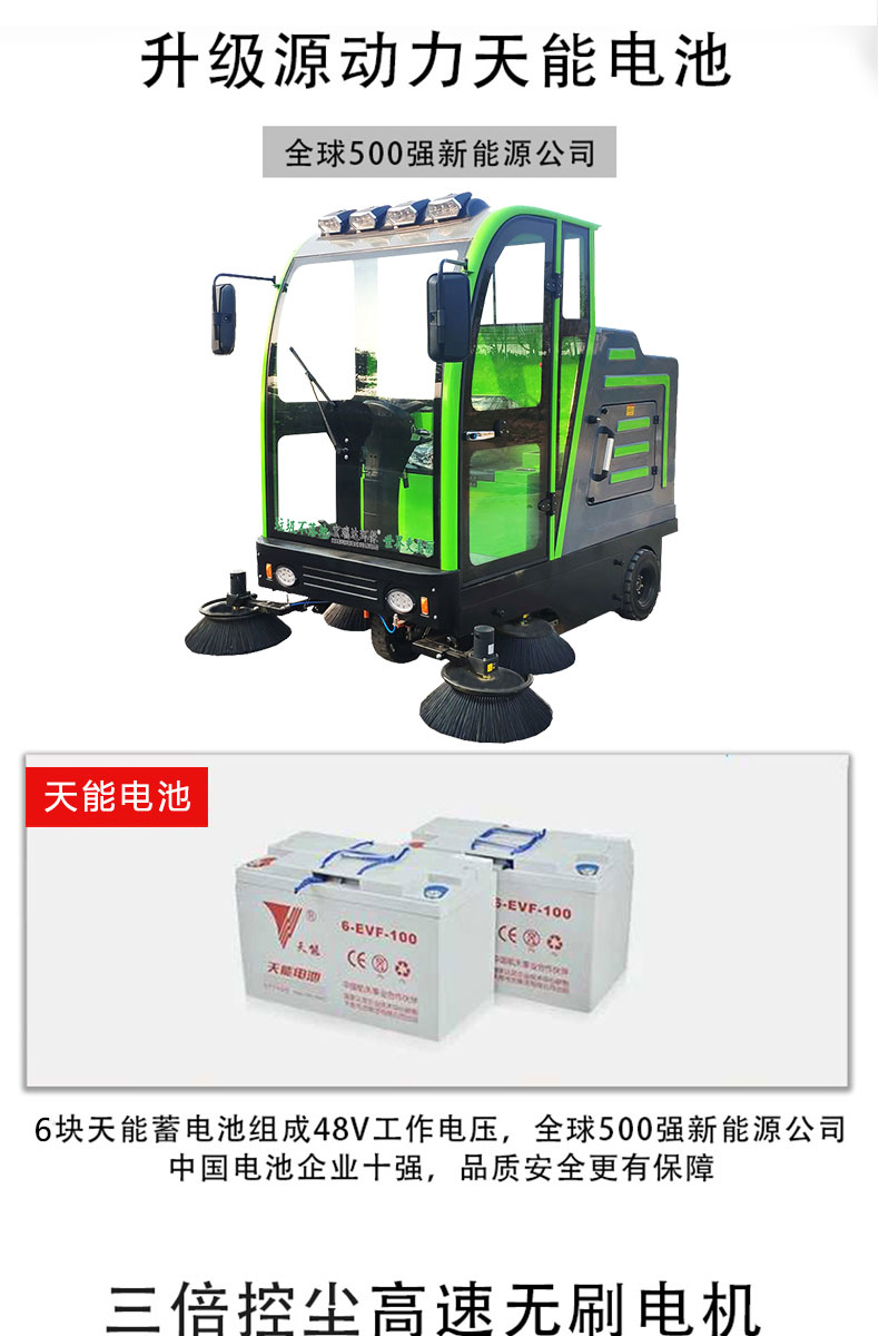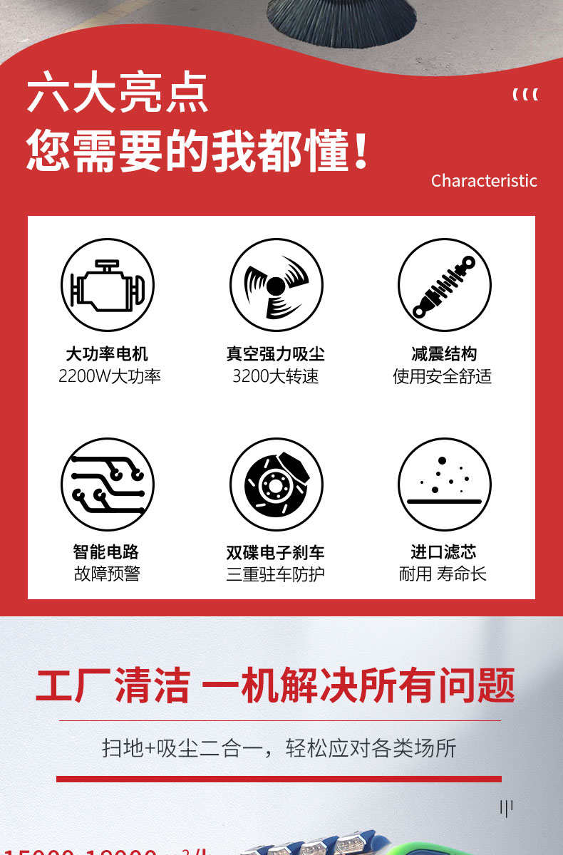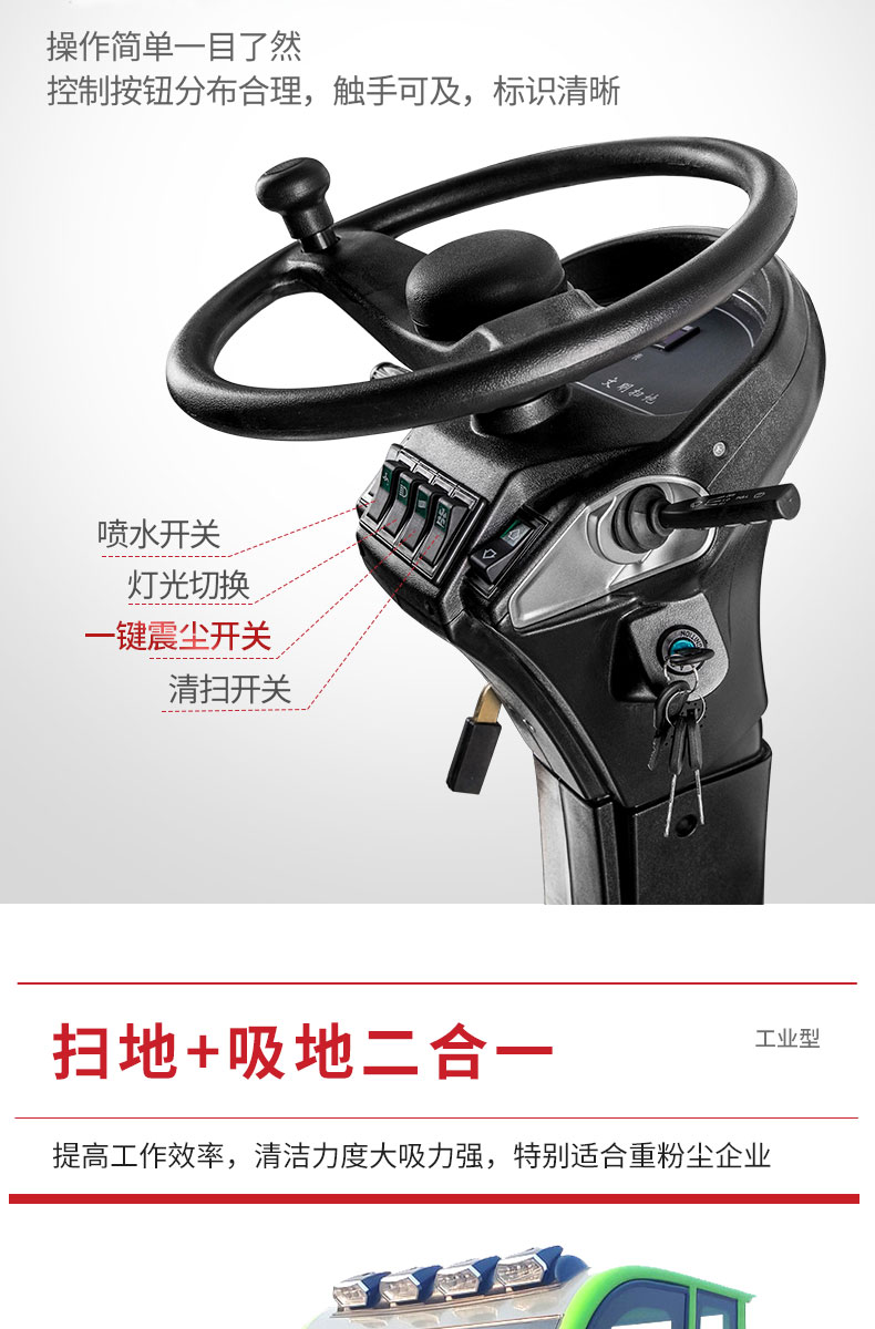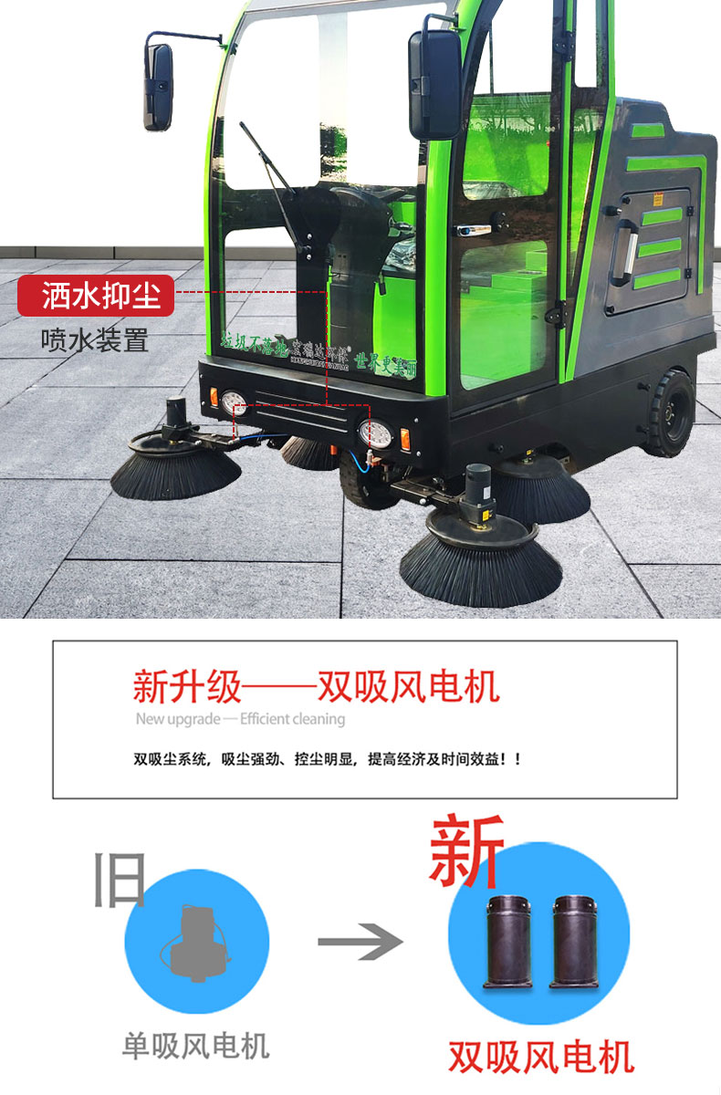 - 產品特點: ●內置強大控塵系統,雙吸塵風機,吸塵能力更強,掃地寬度可達2000mm。 ●過濾系統采用雙桶式濾芯,保養維護更方便,過濾面積更大。