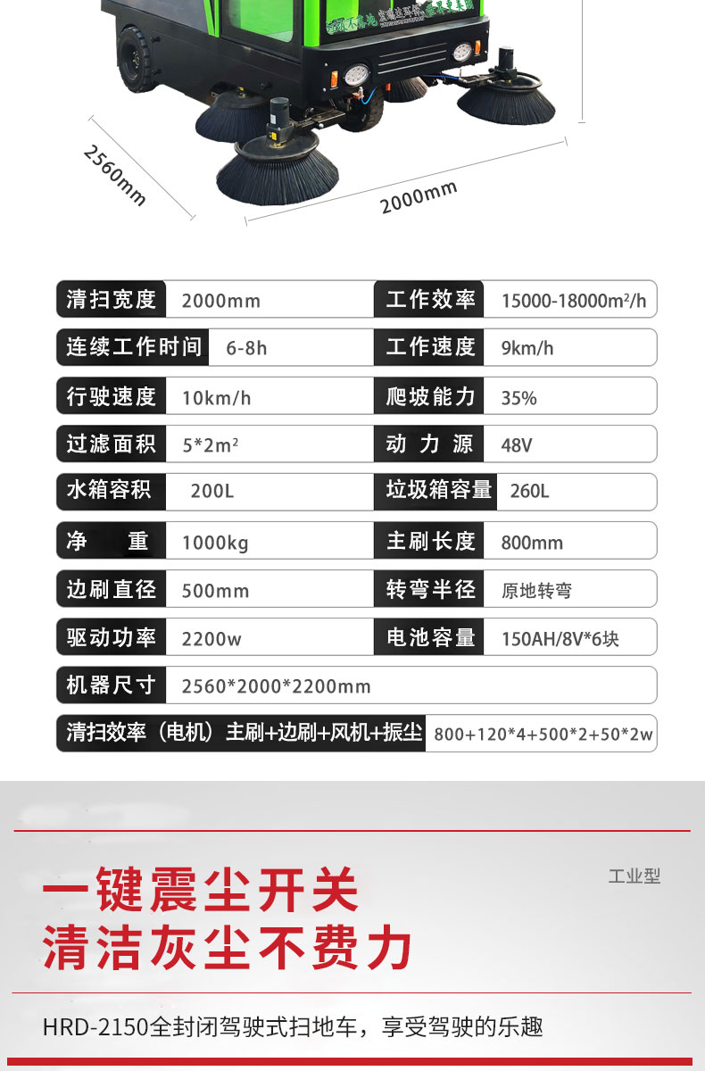HRD-2150全封閉駕駛式掃地車是宏瑞達環保根據市場客戶需求特研發針對粉塵企業的電動清掃車,配置雙風機系統,具有強大的吸塵能力,清掃寬度大可達2米,連續工作時間可達6-8小時,特別適合煤礦、水泥廠、雕刻廠、面粉廠、建材廠、金屬冶煉廠這種灰塵多的場所使用,用于工廠車間、商場、車站、廣場公園、景區等場所清掃效果會更加顯著。